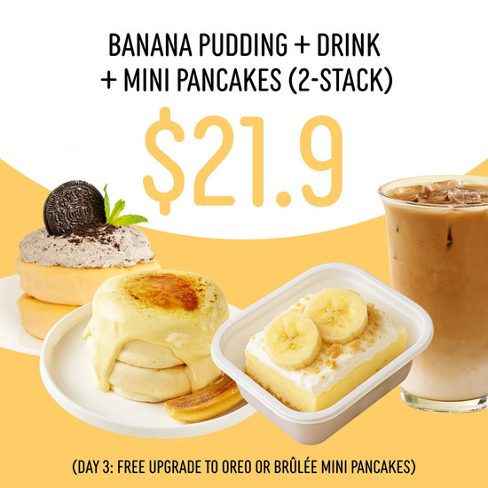 FREE UPGRADE TO OREO or CRÈME BRÛLÉE MINI PACAKES with purchase of “Bundle Promotion - $21.90” Banana Pudding + Mini Pancakes (2-stack) + Drink (for registered guests only)